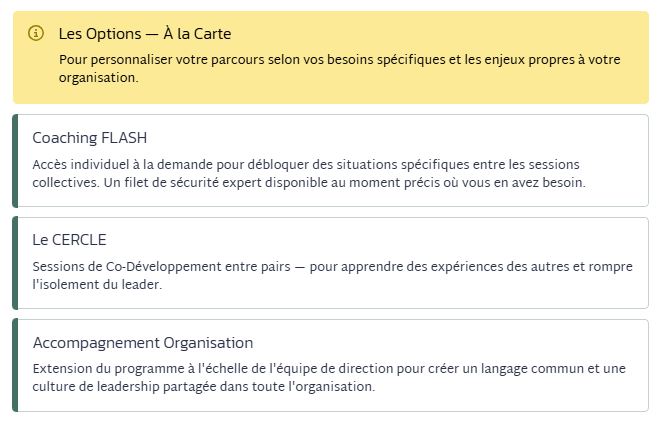 Ce parcours part d'un postulat fondamental : la transformation d'une organisation commence toujours par la transformation de celui ou celle qui la dirige. Votre corps, vos émotions, votre système nerveux — ces dimensions trop souvent ignorées sont pourtant les premières sources de votre leadership.